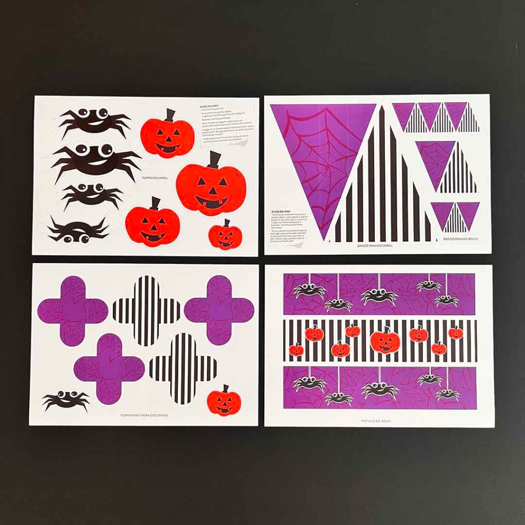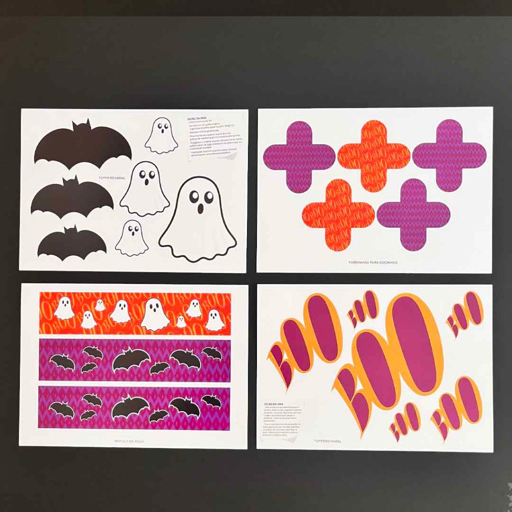 A ideia é simples: você escolhe o tema que mais combina com o seu estilo — pode ser aranhas e abóboras para um clima clássico ou morcegos e fantasmas para um ar divertido —, faz o download do arquivo digital e imprime quantas vezes quiser. Depois, é só recortar e começar a montagem. Em pouco tempo, sua sala ou jardim se transforma em um cenário assustador e encantador.