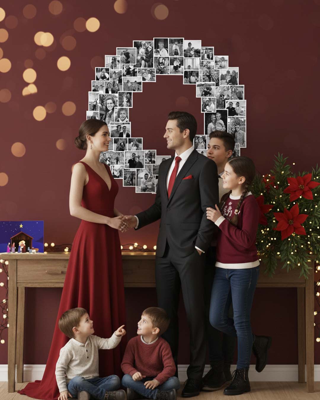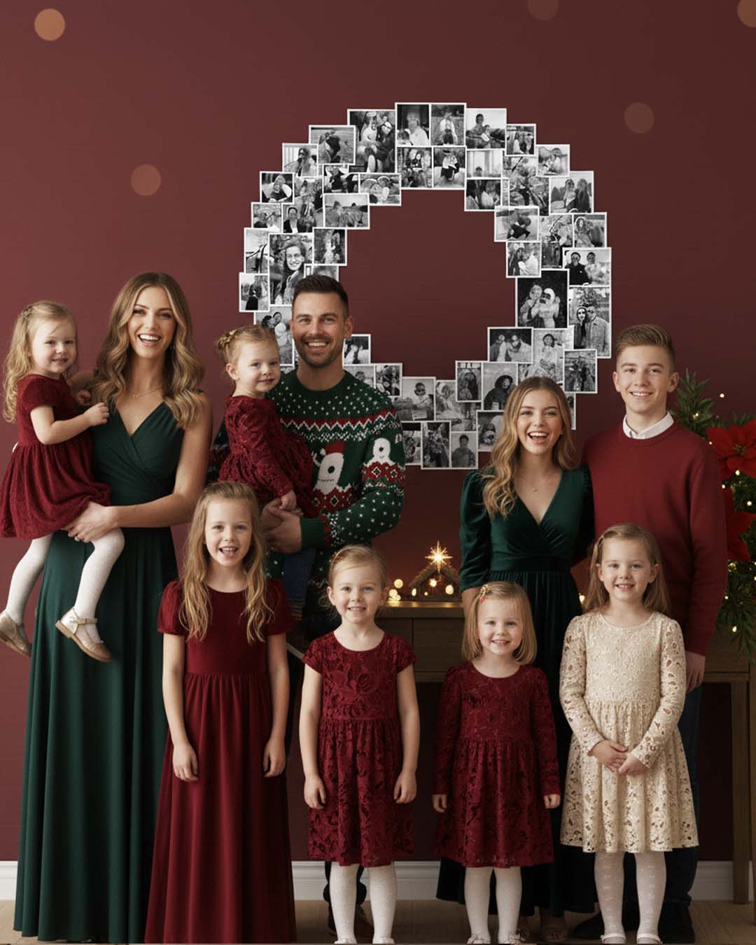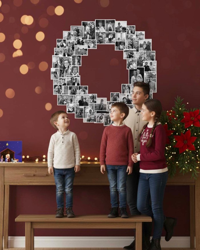 Uma ideia linda e significativa para eternizar esses momentos é o painel fotográfico em formato de guirlanda. Ele reúne as lembranças mais especiais da sua família e ainda se transforma em um cenário instagramável que faz sucesso na noite de Natal. Além de decorar, ele desperta emoções: é impossível olhar para as fotos sem comentar, relembrar, soltar boas risadas e reviver histórias que marcaram cada ano.